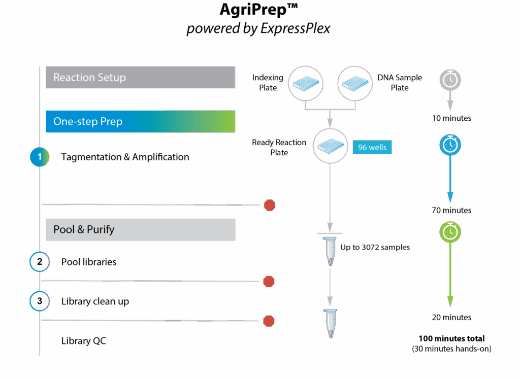 Bred for NGS library prep workflow simplicity and throughput! Powered by the one-step ExpressPlex workflow, AgriPrep is optimized for plant & animal low-pass WGS & SKIM-sequencing and goes from extracted genomic DNA to sequence-ready libraries in 100 minutes.