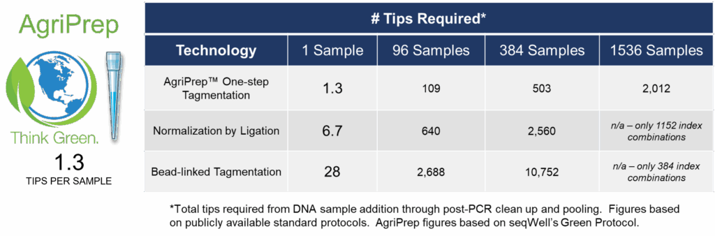 AgriPrep’s pre-plated reagents, one-step tagmentation & amplification method, early sample pooling, and sequential reagent addition provide a highly streamlined workflow that results in the use of <2 tips/sample. When combined with the availability of 3072 indexes, AgriPrep offers unmatched scalability while minimizing environmental impact.