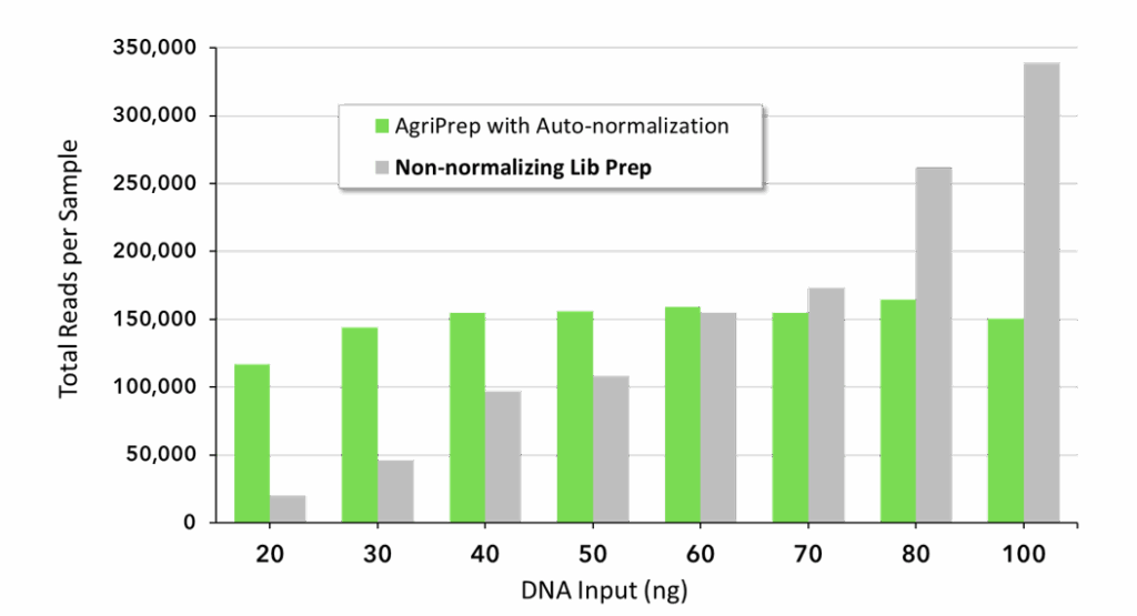 Reduce required sequencing by 80%! AgriPrep with auto-normalization and a non-normalizing library prep method were each used to prepare 8 samples with variable starting DNA inputs between 20 – 100 ng. Following library prep, samples were pooled by equal volume per method for sequencing. If each pool was sequenced to 1.2 million reads and the target was ≥100,000 reads per sample, the AgriPrep pool with highly consistent read counts can achieve ≥100,000 reads for all samples during the sequencing run. However, the non-normalizing prep pool would require 5X more additional sequencing (6 million reads total) to bring the lowest represented sample in the pool to ≥100,000 reads due the high variance in read counts.