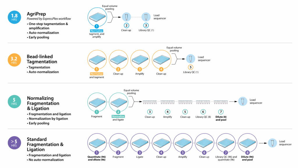 Bred for NGS library prep workflow simplicity and throughput! Powered by the one-step ExpressPlex workflow, AgriPrep is optimized for plant & animal low-pass WGS & SKIM-sequencing and goes from extracted genomic DNA to sequence-ready libraries in 100 minutes.