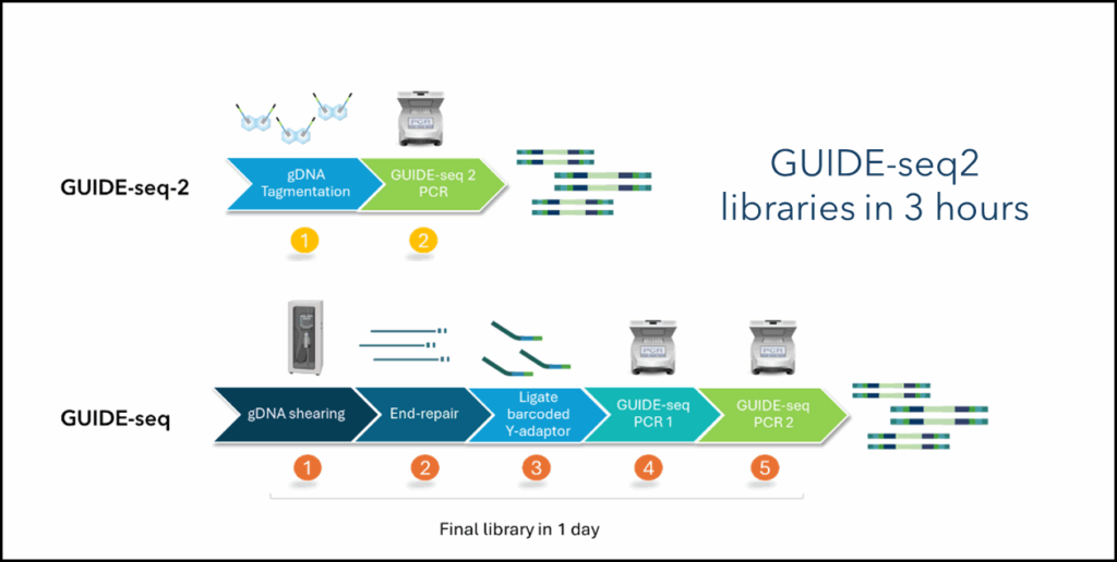 “The simplified GUIDE-seq-2 workflow substantially streamlines the process and enables high-throughput experiments, while also decreasing the requirement of input genomic DNA for library preparation by approximately 4-fold.” – Developers of GUIDE-seq23