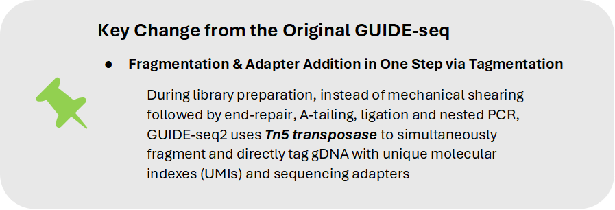 The evolution from GUIDE-seq to GUIDE-seq2 mirrors the successful transition seen in CIRCLE-seq to CHANGE-seq. Tagmentation is redefining how off-target assays keep pace with the scale and precision of modern sequencing. For researchers and developers, GUIDE-seq2 represents not just an incremental update, but a transformational one—making in-cell off-target detection more accessible, reliable, and ready for population-scale studies.