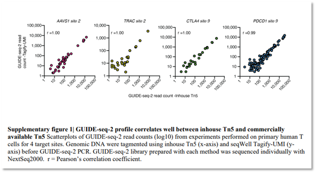 The GUIDE-seq-2 protocol incorporates Tn5 transposase loaded directly with P5/i5 sequence adapters and UMI indexes (Tagify™ i5 UMI from seqWell), demonstrating how loaded transposases can streamline workflows, increase efficiency, and reduce manual steps. While laboratories can express, purify and load Tn5 inhouse, the correlation to the commercially available counterpart provides researchers easy access to a highly consistent and fully-QC’d source of this critical assay reagent.