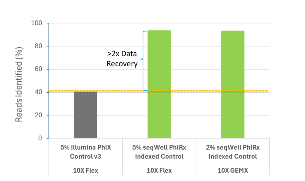 “The Boston University Single Cell Sequencing Core accepts a variety of projects and some, like 10X Flex or GEMX, often require sequencing just one or a few multiplexed libraries at a time. Sequencing this on current XLEAP chemistry with Illumina unindexed PhiX would lose up to 80% of the data to unidentifiable reads due to low index complexity. By bioinformatically truncating the indexes or using just one of the two indexes, we can recover these reads but it takes additional time and effort and we are concerned about potential data misattribution in case of the index hopping. Sequencing accuracy and confidence in the data is important to us and our customers. We now happily use a 2-5% spike-in of the PhiRx Indexed Control which completely resolves this issue. “
