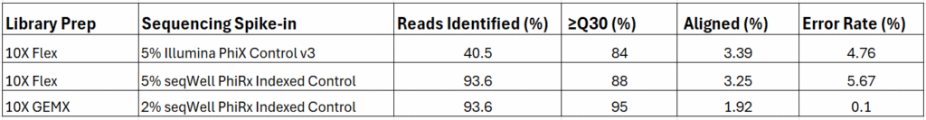 This data was generated from sequencing runs of 10X Flex and GEMX libraries with an Illumina PhiX Control V3 or with seqWell’s PhiRx Indexed Control equivalent spike-ins. The libraries were prepared by the Boston University Single Cell Sequencing Core and sequenced by the Microarray & Sequencing Resource.
